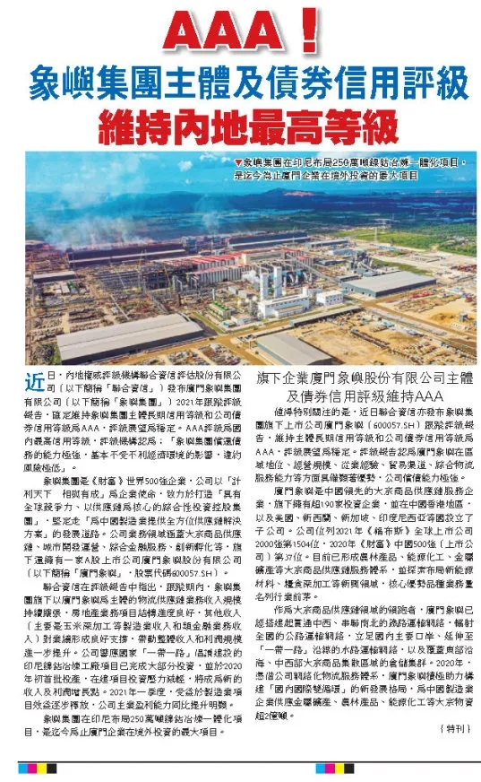 港媒聚焦 | 象嶼集團(tuán)、廈門象嶼主體及債券信用評(píng)級(jí)維持國(guó)內(nèi)最高等級(jí)